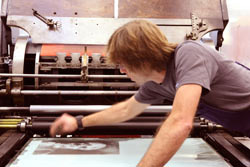 Lithography is the reproduction of an image, which has been drawn with a greasy crayon or ink, onto limestone (or zinc). It works because of the mutual repulsion of oil and water. Water keeps oil-based ink from attaching onto the non-printing areas, and the greasy parts of the stone permit the ink to stick.