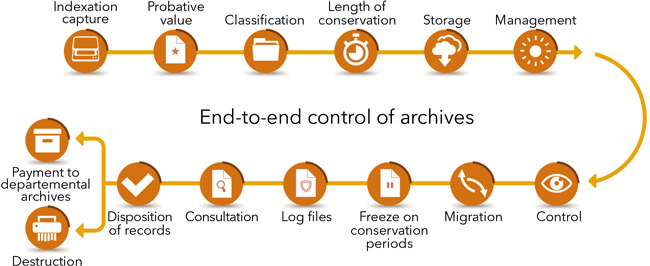 - Physical archiving throughout the statutory conservation period (or DUA - Period of Administrative Value) on a site approved by the Archives de France