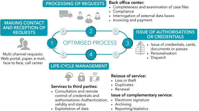 Specifically for public administrations and businesses, the complete management of the ID issuing process offer (credentials and passes) receives and manages the treatment of all multi-channel requests and related life cycles.