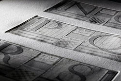 Tailles-douces tirées sur vélin d’Arches 270 g sur une presse du XVIIIe siècle de l’atelier du Livre d’art et de l’Estampe de l’Imprimerie nationale.
