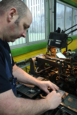 La Linotype est une fondeuse-composeuse qui réalise des lignes-blocs. La Linotype compose une ligne de matrices, la justifie, fond et rabote la ligne pour la livrer sur une galée, à la suite de la précédente, prête à être mise en page et imprimée. Les matrices sont ensuite redistribuées dans les canaux du magasin à matrices. Philippe Mérille, qui dirige cet atelier a été formé par Joël Bertin, qui fait partie des 124 Maîtres d’art nommés par le ministère de la Culture et de la Communication depuis 1994.