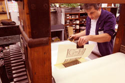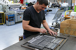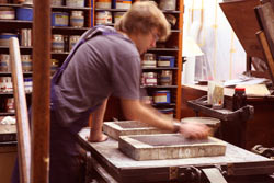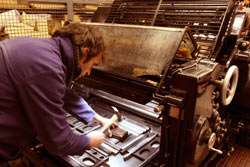 Impression des compositions en relief. En typographie, l'impression se fait par encrage de la composition installée dans une forme puis par pression sur le papier présenté feuille par feuille. L’atelier du Livre d’art et de l’Estampe dispose de plusieurs presses typographiques permettant d’imprimer dans différents formats.