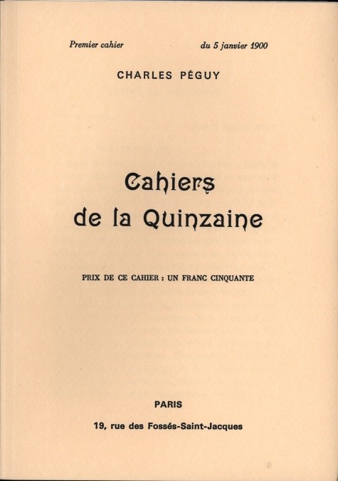 Dans le cadre de cette commémoration sont réédités à l’identique, selon la méthode typographique la plus traditionnelle, les Cahiers de la Quinzaine, œuvre majeure de Charles Péguy.