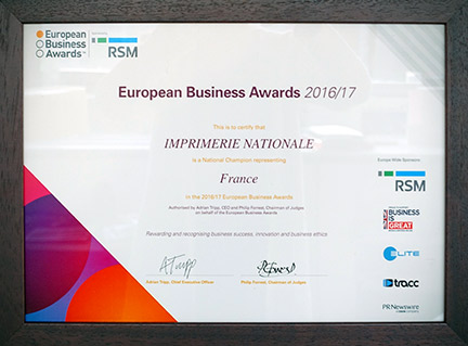 Choisi comme l’une des 110 sociétés européennes les plus dynamiques et passionnantes, le Groupe Imprimerie Nationale est sélectionné comme finaliste pour les European Business Awards par catégorie et a obtenu un ruban d’honneur !