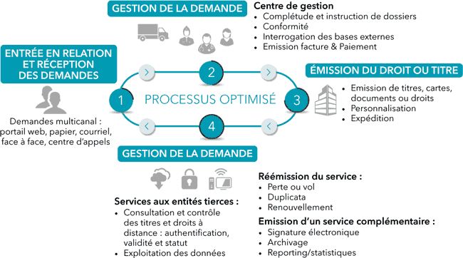 Dédiée aux administrations et aux entreprises, l’offre de gestion complète des processus d’émission des identités (titres et droits) capte et gère le traitement de toutes les demandes multicanal et des cycles de vie associés.